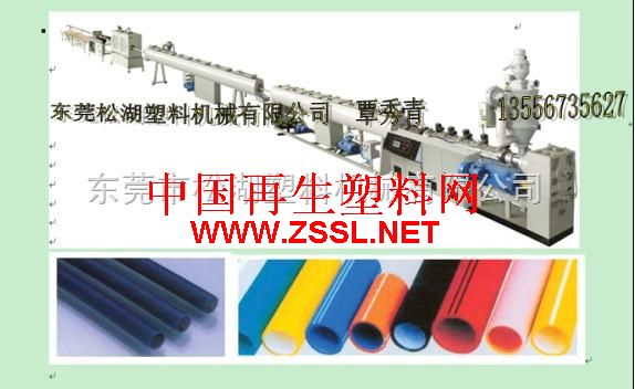 东莞松湖塑料机械有限公司我公司生产的生产工艺:挤出机—模具—真空定型箱—牵引机—切割机—落料架PVC管材生产线主要用于生产PVC给水管和PVC排水管,生产线由锥形双螺杆挤出机、机头、真空定型装置、多履带牵引机、切割机、翻转架组成,可以根据不同的客户需求选择锥形、平行双螺杆挤出机。采用高效锥形双或平行双螺杆挤出机,保证高效挤出,适合于PVC加工的分流式机头,既保证了高速挤出的稳定性,双避免了非结晶性塑料的分解反应,提高了管材质量。采用高效真空定径技术和喷淋冷却水箱,提高管材的成品率,满足高速生产的需要,采用双履带和多履带牵引机,牵引力大且均匀平稳,进口变频调速实现了准确的速度调节,保证生产线平稳运行。采用高速、精确设计的切割机,切割断面平整,带有自动倒角功能,便于管材的连接。采用双炉加热的全自动扩口机,真空定径,既保证了扩口的质量,又提高了扩口效率。采用电脑控制,生产线采用PLC和大屏幕触摸屏控制系统或德国BECKHOFF工业计算机总线控制系统